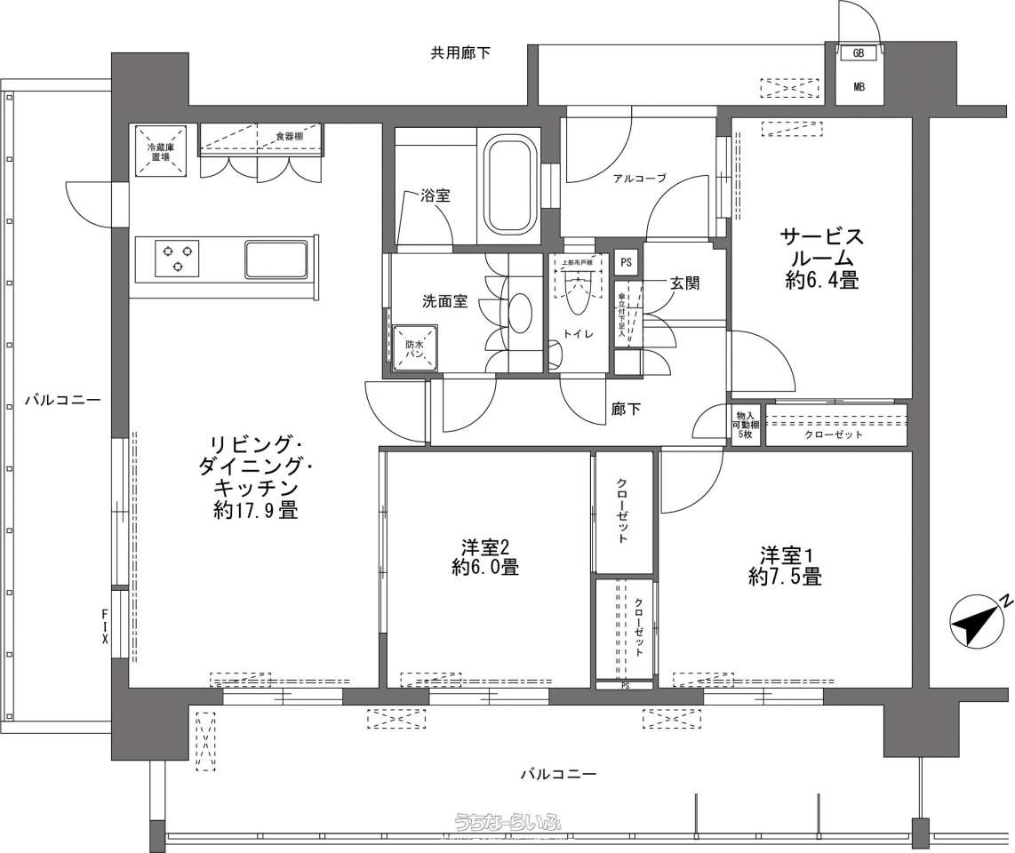 | 間取り | 2LDK ( 洋7.5 洋6 LDK17.9 ※サービスルーム(約6.4畳)) | ||