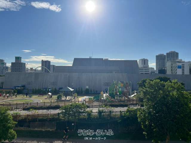 ウォーキングを楽しんだりテニスやバスケット等の施設も充実している新都心公園が目の前で