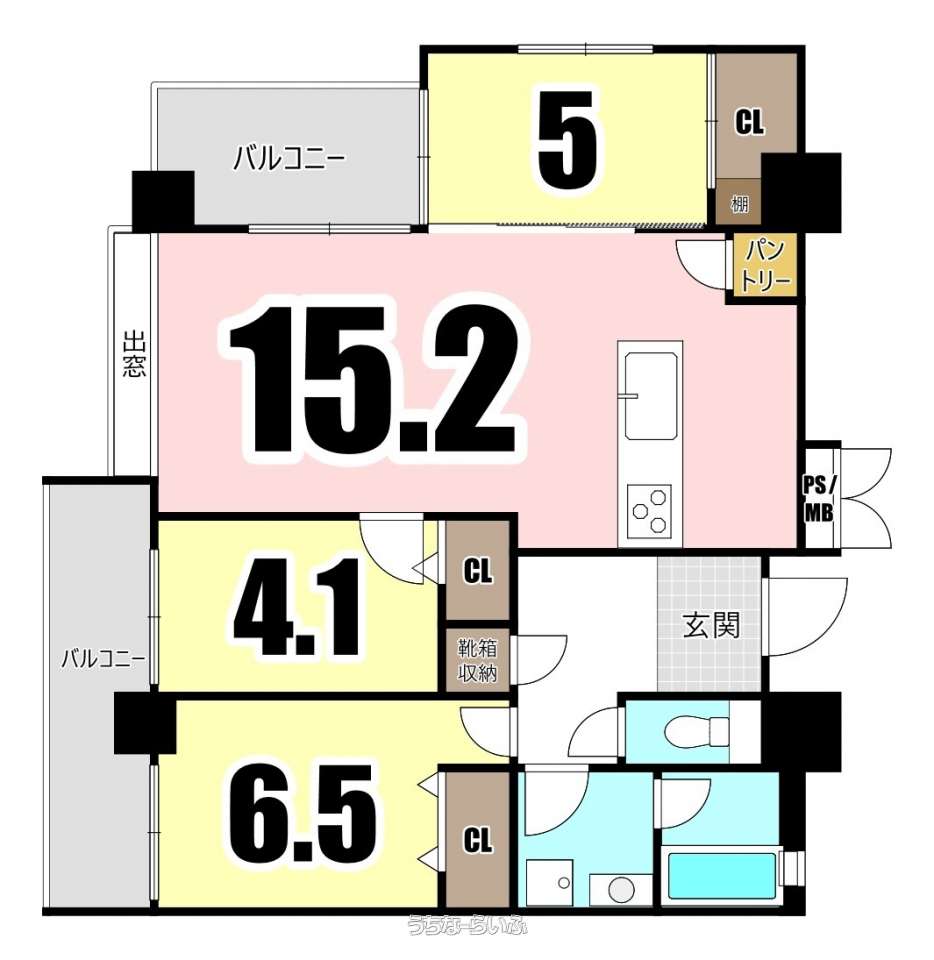 | 間取り | 3LDK ( 洋6.5 洋5 洋4.1 LDK15.2 ※二面バルコニー、角部屋) | ||