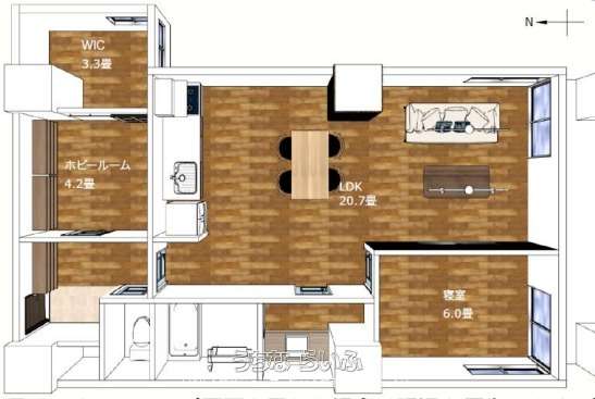| 間取り | 1LDK ( 洋6 LDK20.7 ※バルコニー・ホビールーム・ウォークインクローゼット) | ||