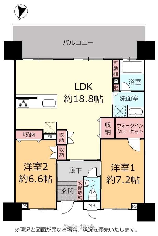 | 間取り | 2LDK ( 洋7.2 洋6.6 LDK18.8 ※WIC付) | ||