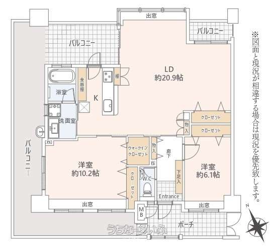 | 間取り | 2LDK ( 洋10.2 洋6.1 LDK20.9 ※3面バルコニー) | ||
