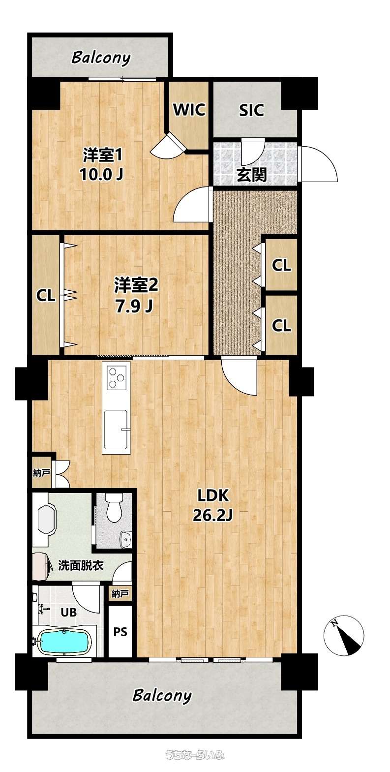 | 間取り | 2LDK ( 洋10 洋7.9 LDK26.2 ※10帖と7.9帖の広々洋室が2つと、26.2帖の広々LDK☆廊下収納や玄関収納もあり、収納力バッチリ☆) | ||