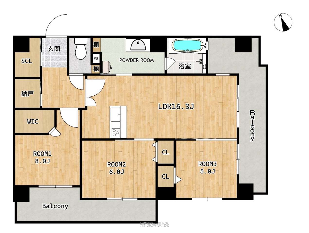 | 間取り | 3LDK ( 洋8 洋6 洋5 LDK16.3 ※【登記面積:78.52㎡】【専有面積:81.95㎡】※全ての居室とリビングがbalconyに面し、南・東に広がる眺望を見渡せる角部屋ならではの贅沢な間取☆玄関のSCLや納戸、主寝室のWCLなどの豊富な収納が魅力です!) | ||