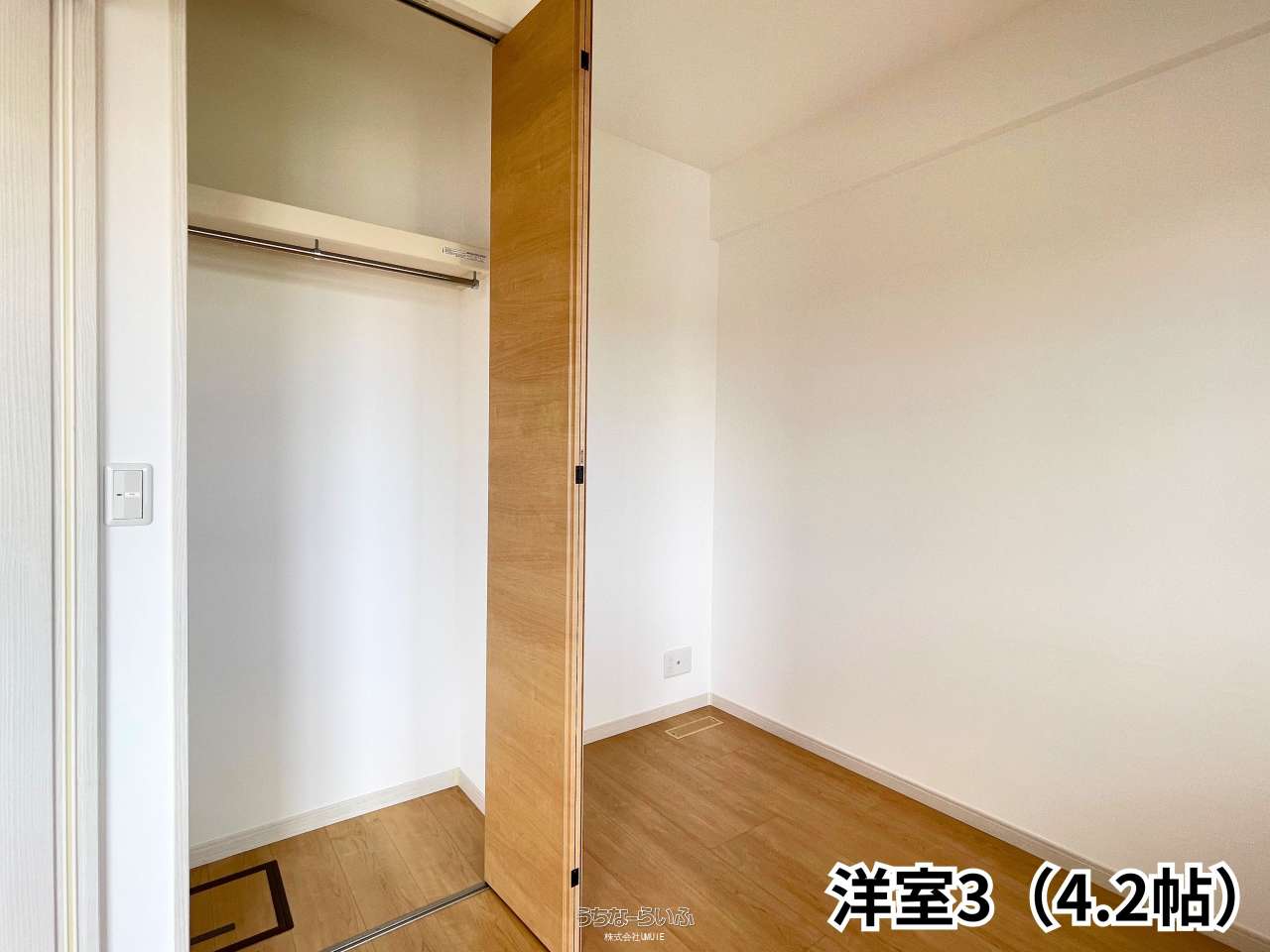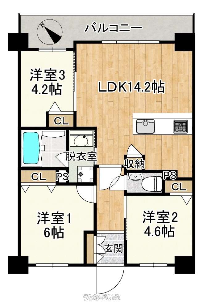 | 間取り | 3LDK ( 洋6 洋4.6 洋4.2 LDK14.2 ※廊下を挟み、お部屋があるプライベートを重視した間取お♪水回りは横一線で近くにあるため、家事がしやすい設計になっております!) | ||