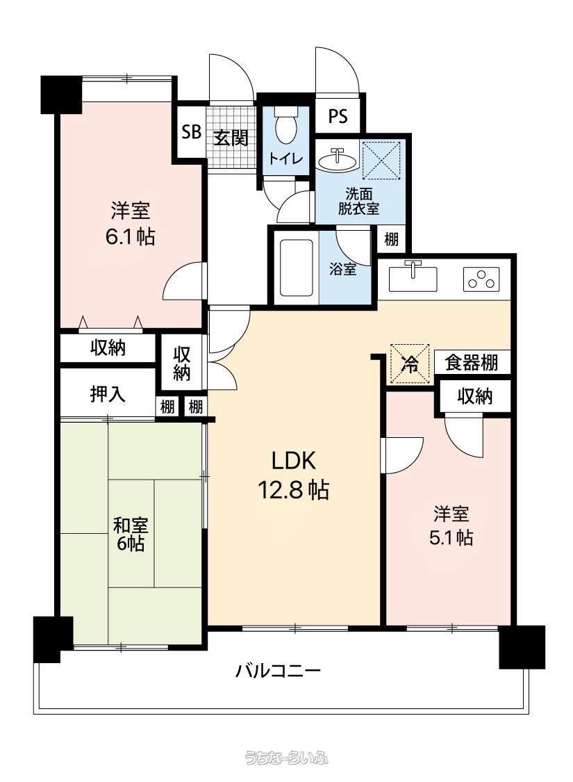 | 間取り | 3LDK ( 洋6.1 洋5 和6 LDK12.8 ※相違がある場合は現況優先とします。) | ||