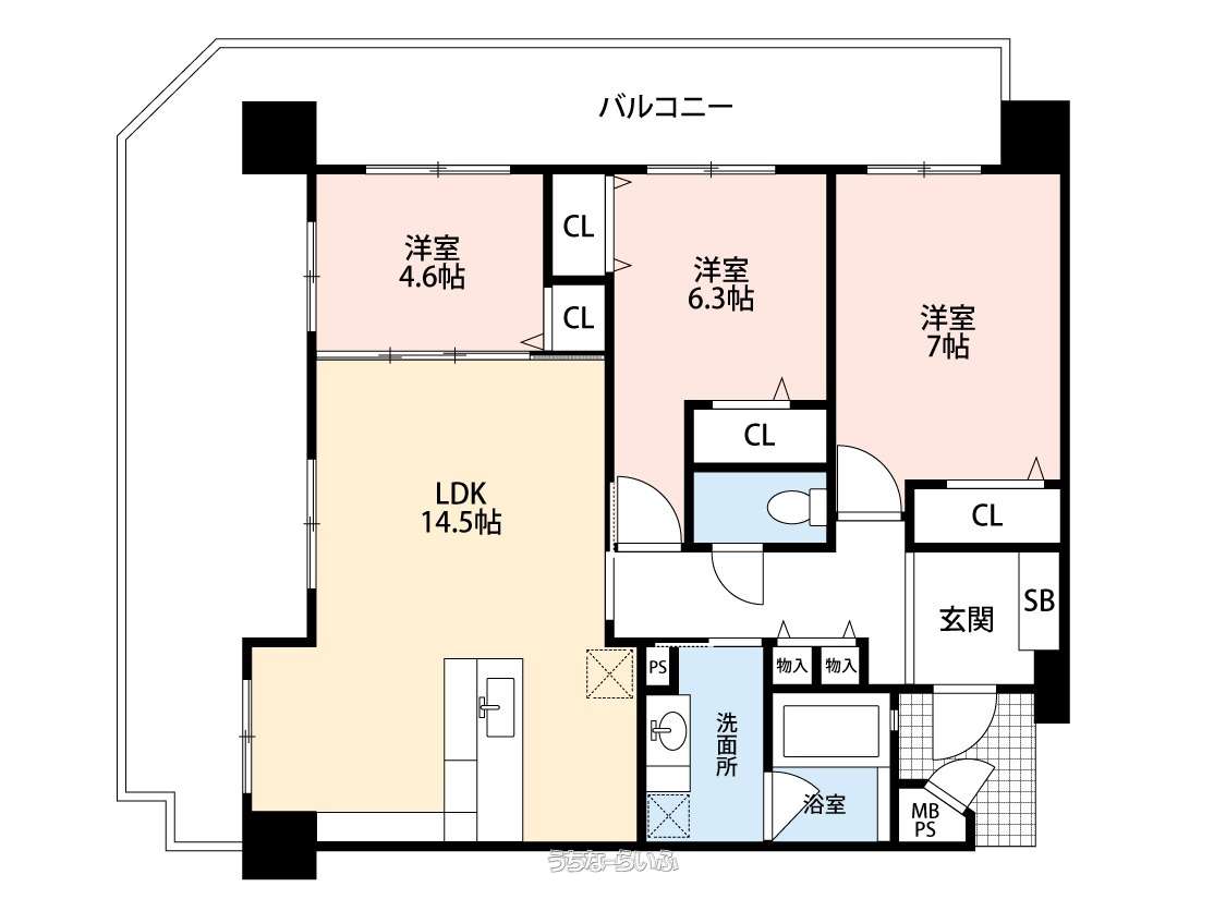 | 間取り | 3LDK ( 洋7 洋6.3 洋4.6 LDK14.5 ※相違がある場合は現況優先とします。) | ||