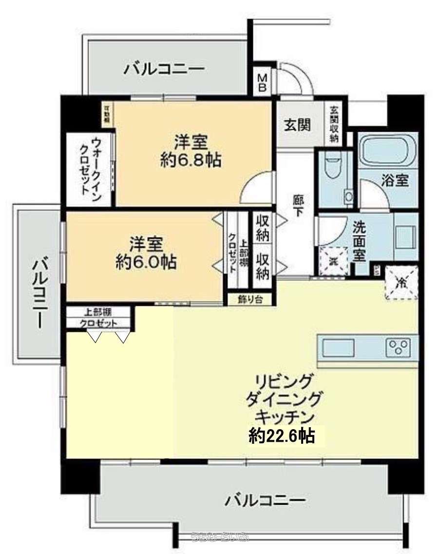 間取り | 2LDK ( 洋6.8 洋6 LDK22.6 ※LDK22.6帖はゆとりある広さで、ダイニングやソファの配置もしやすく、ご家族が集まりやすい空間です。洋室6.8帖は寝室や書斎に、6.0帖は子ども部屋や趣味のスペースにちょうど良いサイズ感。暮らしに合わせて多目的に使える間取りで、家族構成やライフスタイルの変化にも柔軟に対応できます。) | ||