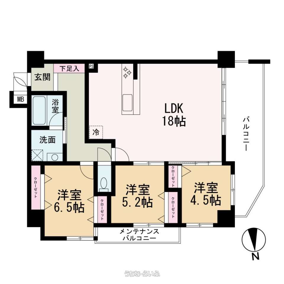 | 間取り | 3LDK ( 洋6.5 洋5.2 洋4.5 LDK18 ※LDK18帖の広々空間に、洋室6.5帖・5.2帖・4.5帖を備えた3LDKの間取り。家族の団らんや来客対応にもゆとりのあるリビングが魅力です♪全居室に収納があり、主寝室は6.5帖でゆったり。子ども部屋やワークスペースとしても使いやすい間取り設計となっています♪) | ||
