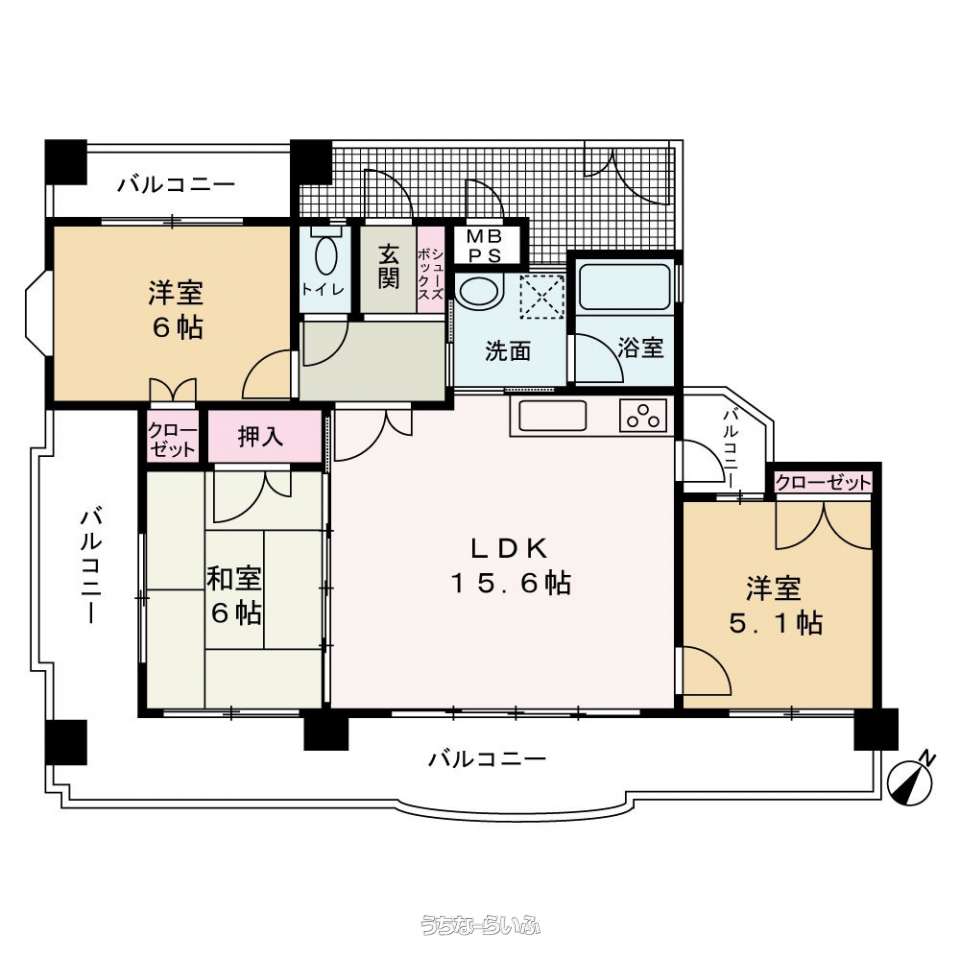 | 間取り | 3LDK ( 洋6 洋5.1 和6 LDK15.6 ※LDK15.6帖のゆとりある空間に、6帖和室を併設した使い勝手の良い間取りです♪急な来客時の応接や子どものお昼寝スペースとしても重宝します♪洋室は6帖と5.1帖を配置し、主寝室・子ども部屋・書斎など多目的に利用可能♪家族それぞれが心地よく過ごせるバランスの良い3LDKです♪) | ||