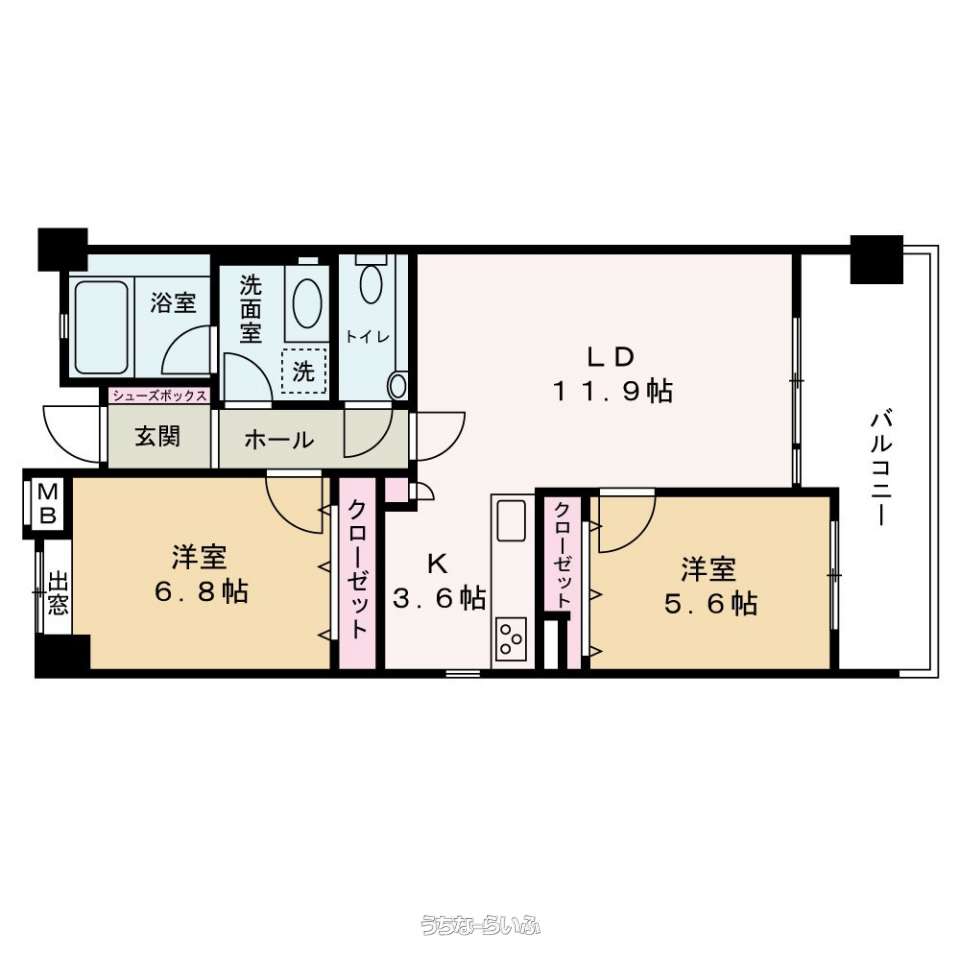 | 間取り | 2LDK ( 洋6.8 洋5.6 LDK15.5 ※LDK15.5帖のゆとりあるリビングを中心に、洋室6.8帖・5.6帖をバランスよく配置した2LDKプラン♪家具配置がしやすい広さで、リビングと各洋室の動線もスムーズ♪寝室・子ども部屋・書斎など多用途に使え、2人暮らし〜ファミリーまで快適に暮らせる間取りです♪) | ||