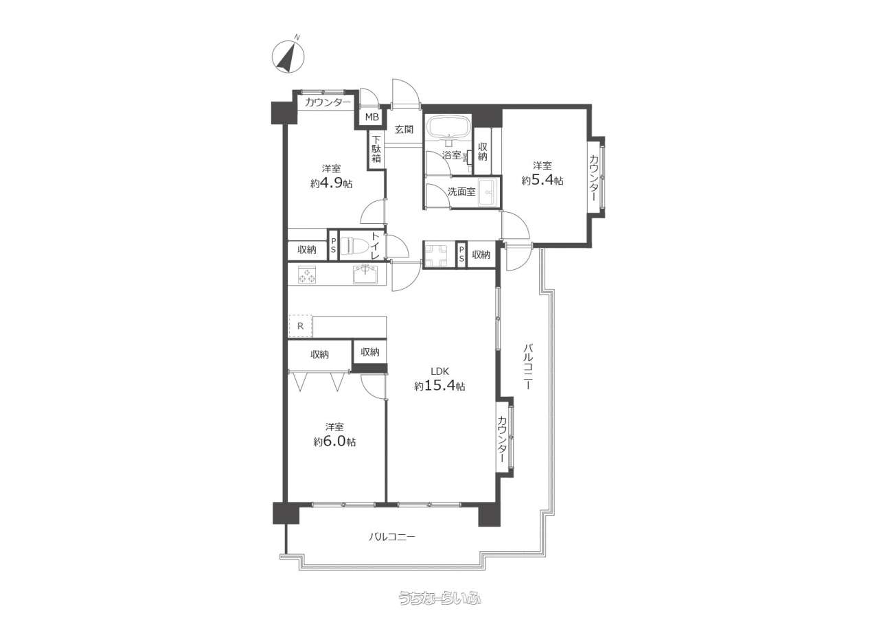 | 間取り | 3LDK ( 洋6 洋5.4 洋4.9 LDK15.4 ※家族が集まるLDK約15.4帖を中心に、洋室6帖・5.4帖・4.9帖を配置した使い勝手の良い3LDK。リビング横の洋室は子ども部屋やワークスペースとしても活用可能。各居室に収納を確保し、お部屋をすっきり保てます。主寝室としても使いやすい6帖の洋室をはじめ、ライフスタイルに合わせて柔軟に使える間取り。ファミリー層にもおすすめの住みやすい住空間です。) | ||