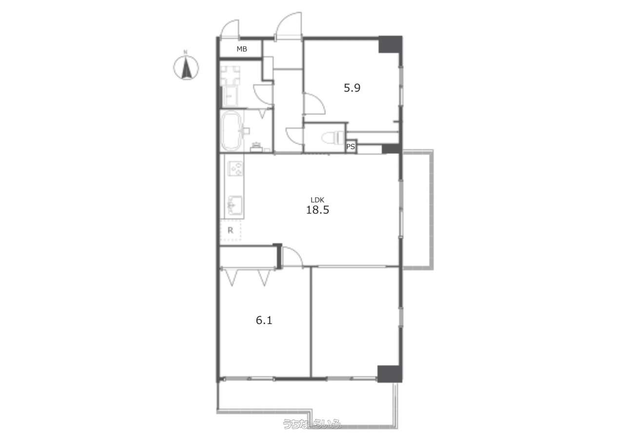 間取り | 2LDK ( 洋6.1 洋5.9 LDK18.5 ※最上階、角部屋、二面バルコニー) | ||