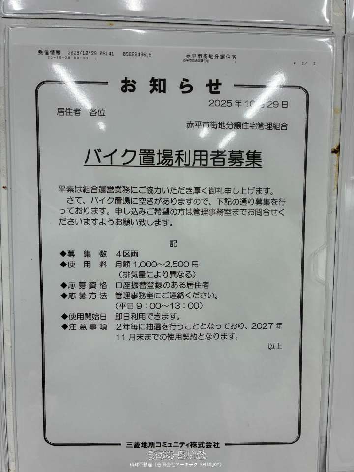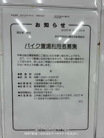 | 駐車場 | 1台5,500円 ※駐車上に関しては2年ごとの抽選になります。車両所有者が少ないため抽選から漏れることは低いと思われます。 ※軽自動車5,500円・乗用車6,000円 | 引き渡し | 相談 (2026年4月1日以降) |