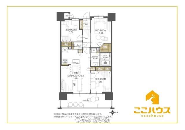 | 間取り | 3LDK ( 洋6.5 洋5 洋5 LDK14 ※ウォークインクローゼット、オープンキッチン、各居室収納、パントリー) | ||