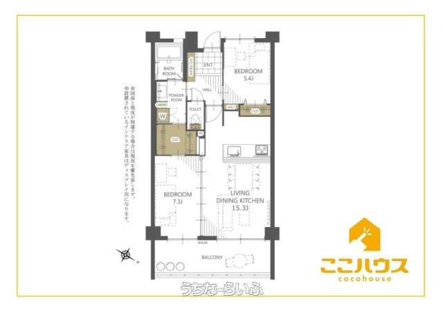 | 間取り | 2LDK ( 洋7.3 洋5.4 LDK15.3 ※ウォークスルークローゼット、オープンキッチン、各居室収納) | ||