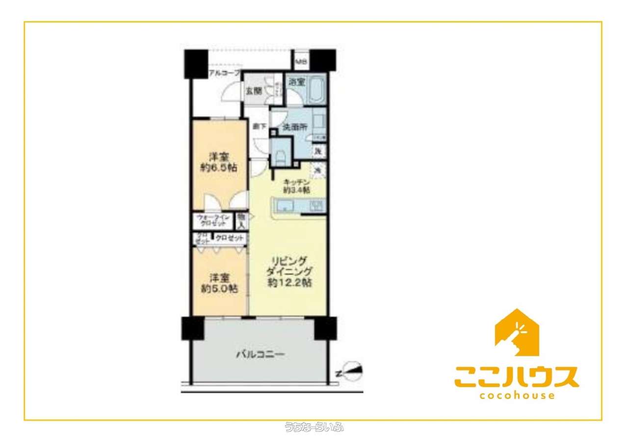 | 間取り | 2LDK ( 洋6.5 洋5 LDK12.2 ※オープンキッチン、各居室収納、リビング収納) | ||