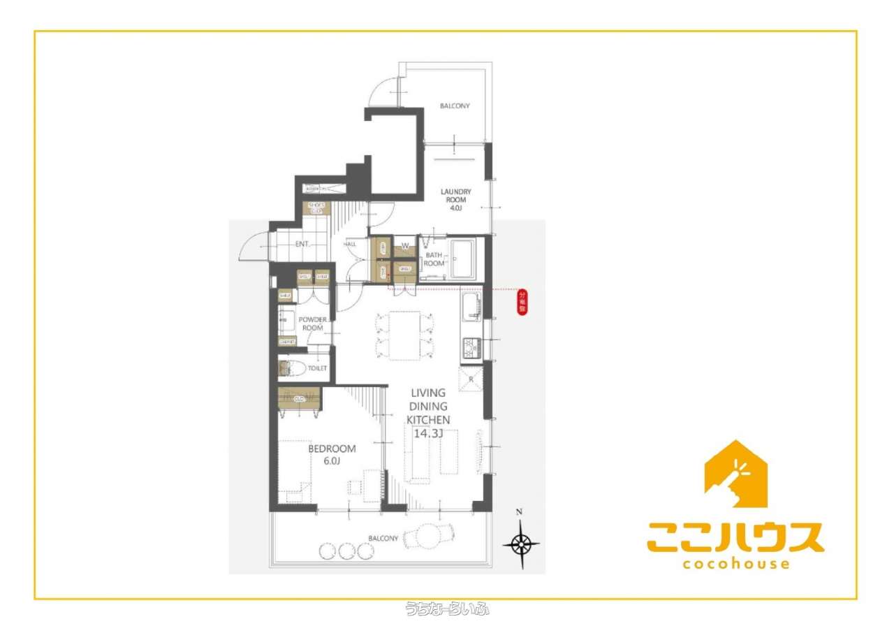 | 間取り | 1LDK ( 洋6 LDK14.3 ※ランドリールーム、リネン庫、パントリー、廊下収納) | ||
