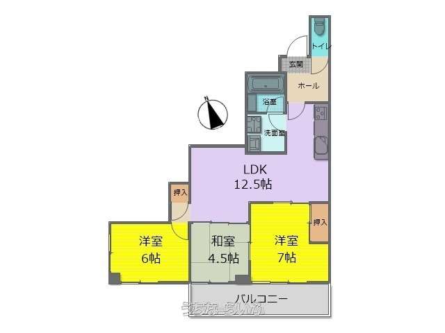 | 間取り | 3LDK ( 洋7 洋6 和4.5 LDK12.5 ※バルコニー:5.00㎡) | ||
