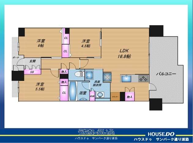| 間取り | 3LDK ( 洋6 洋4.5 洋5.5 LDK16.8 ※■新築時のオプション→食器棚・床ツヤなしコーティング(リビング)・寝室に収納棚設置・神棚・玄関に鏡・ガス乾燥機設置。) | ||