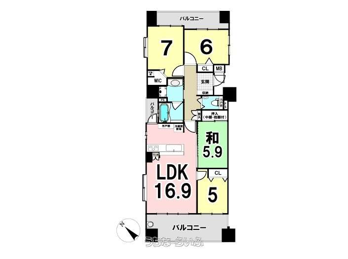 | 間取り | 4LDK ( 洋7 洋6.1 洋5 和5.8 LDK16.9 ※4LDK) | ||