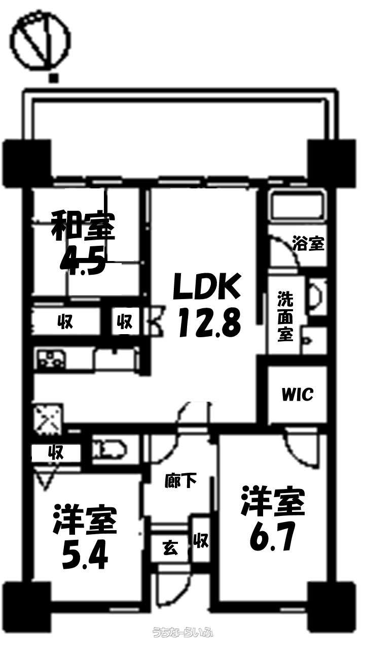 | 間取り | 3LDK ( 洋6.7 洋5.4 和4.5 LDK12.8) | ||
