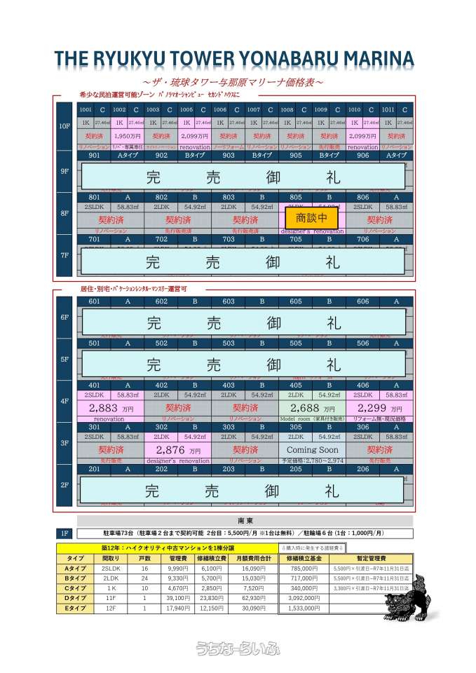 | 備考 | 大規模リニューアル&修繕済み:築12年です☆飯田グループの1棟まるまるリノベーションマンションです。自己居住・将来的に投資物件としも。ペット可・24時間ゴミ出し可♪ 【Youtube動画リンク先】 705・1008号室はこちら→https://www.youtube.com/watch?v=4OITpiHGWZU 1Kタイプのご紹介はこちら→https://www.youtube.com/watch?v=33QHTpVVjm4 修繕積立基金:785,000円 管理会社:(株)琉信ハウジング 設備:沖縄電力株式会社、沖縄協同ガス株式会社 ※詳細はお気軽にお問い合わせください |