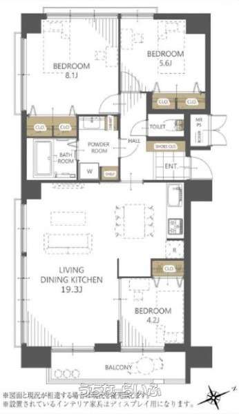 | 間取り | 3LDK ( 洋8.1 洋5.6 洋4.2 LDK19.3 ※角部屋、二面採光、居室収納有) | ||