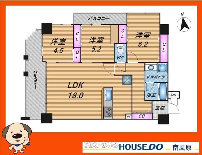 | 間取り | 3LDK ( ※洋6.2 洋5.2 洋4.5 LDK18 ※2面バルコニー・ワンフロア2世帯・角部屋) | ||