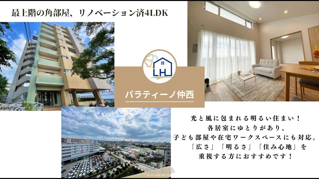【パラティーノ仲西】最上階×角部屋、光と風に包まれる4LDK!58号線まで車で1分、那覇や北部へのアクセスしやすく、利便性に優れた立地。通勤や通学、お出かけにも便利な環境が整っています!