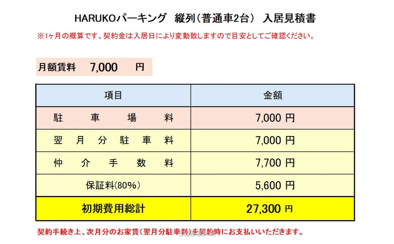 | 料金備考 | 仲介手数料:駐車料(税別)★1台ごとに★車庫証明預かり金30,000円+車庫証明発行手数料3,300円(10%税込) | ||
