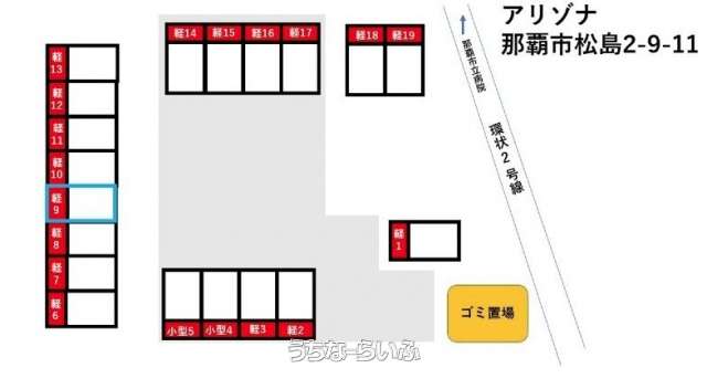 | 備考 | 【那覇市松島2-9-11】 ・軽自動車区画になります。 ・保管場所使用承諾書の発行可能です。 →発行手数料として3,300円がかかります。 ・条件付き駐車場となります。※条件につきましてお問い合わせ下さい※ |