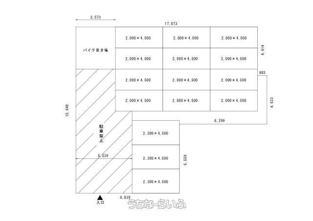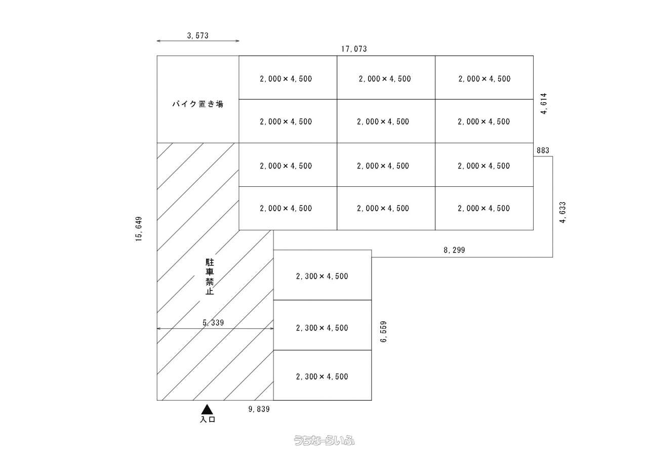 | 備考 | 4.5m×2.0m区画で12台縦列、2.3m×4.5m3台並列駐車可能です。 |