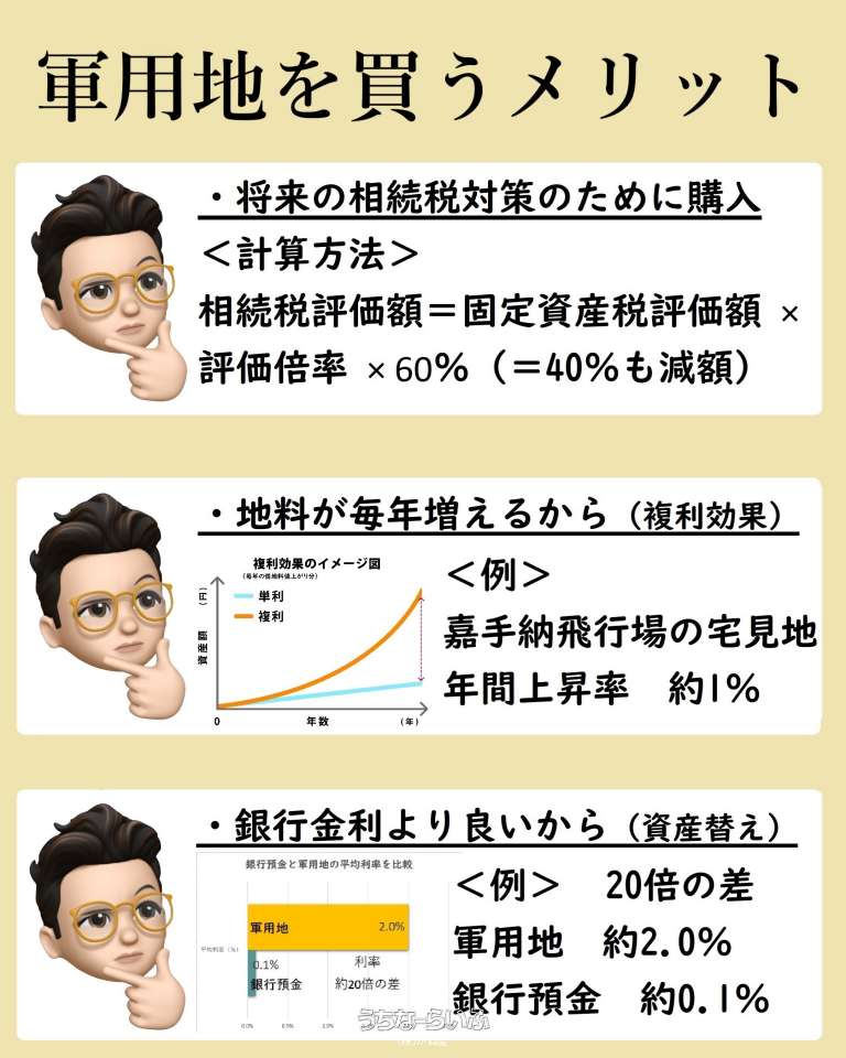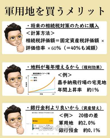 | 備考 | <その他> ■表面利回り:2.08% ■値上がり率:3%(令和7年度) ■相続税評価倍率:3.5(令和7年度) ・相続税評価額=固定資産税評価額 × 評価倍率 × 60%(40%軽減) ■返還予定:未定 ■フェンス:外 ■地料㎡単価:787.55円 ■年間借地料は国がお支払いします(滞納無し) <軍用地を購入した理由アンケート> ●将来の相続税対策と家族のために買いました(家族想い) ●借主の国は滞納しないから(安定収入) ●地料が毎年値上がりして雪だるま式に増えるから(複利効果) ●ほったらかし投資をしたかったから(楽して資産作り) ●不動産投資デビューしやすいと思ったから(ローリスク・ローリターン) ●銀行の金利より良いから(資産替え) |