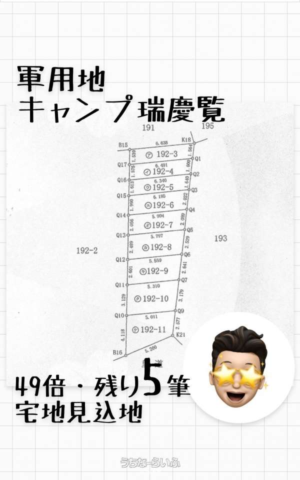 ●キャンプ瑞慶覧 ●単有名義 ●12㎡ ●年間地料21,395円 ●49倍 ●宅地見込地 ●表面利回り2.04% ●返還未定 ※他にも弊社ホームページに軍用地・収入物件情報掲載しております^^