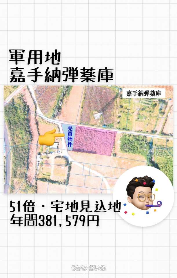●嘉手納弾薬庫 ●単有名義 ●323㎡ ●年間地料381,579円 ●51倍 ●宅地見込地 ●表面利回り1.96% ●返還未定 ※他にも弊社ホームページに軍用地・収入物件情報掲載しております^^