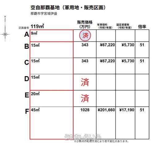 ★価格改定★人気の空自那覇基地・倍率51倍・全6区画中残3区画☆令和7年度賃借料201,660円、上昇率1%、単有名義☆当社売主のため仲介手数料なし☆表面利回り1.96%、相続税対策での購入に他の施設と比較して担保価値が高めで相続税対策、初めての方向けです。お気軽にお問い合わせください♪【空自那覇基地 5つの特徴】●米軍基地ではないから心おきなく投資できる ●那覇空港との共用が生む安定性(返還リスクはゼロに近い) ●固定資産税を納める物件こそ融資に強い(担保価値が高い) ●那覇市民なら迷わず選べる身近さ ●初心者こそ自衛隊施設から始めるべき