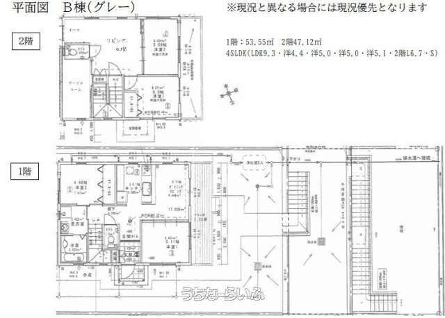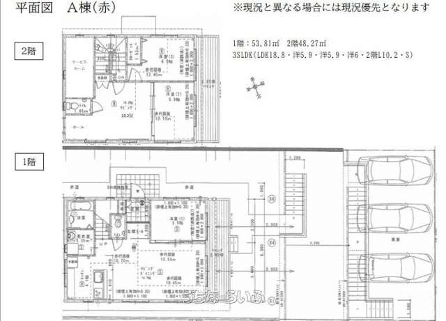| 間取り | 3SLDK ( ※◎A棟(赤):3SLDK(LDK18.8・洋5.9・洋5.9・洋6・2階L10.2・S) ◎B棟(グレー):4SLDK(LDK9.3・洋4.4・洋5.0・洋5.0・洋5.1・2階L6.7・S)) | ペット | - |
