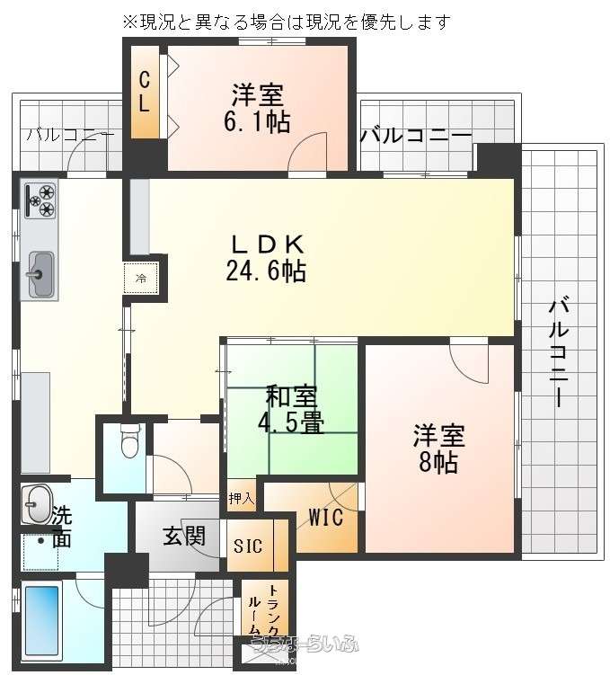 間取り | 3LDK ( 洋8 洋6.1 和4.5 LDK24.6) | ペット | 可 ※規約に準ずる |