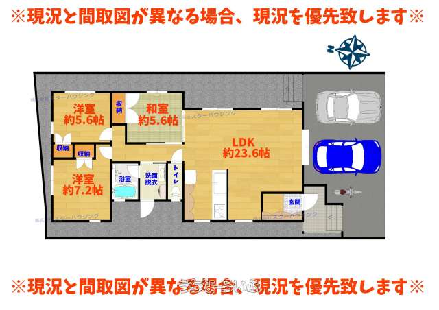 | 間取り | 3LDK ( 洋7.2 洋5.6 洋5.6 LDK23.6 ※各部屋収納有り、和室は襖で仕切り可能) | ペット | - |