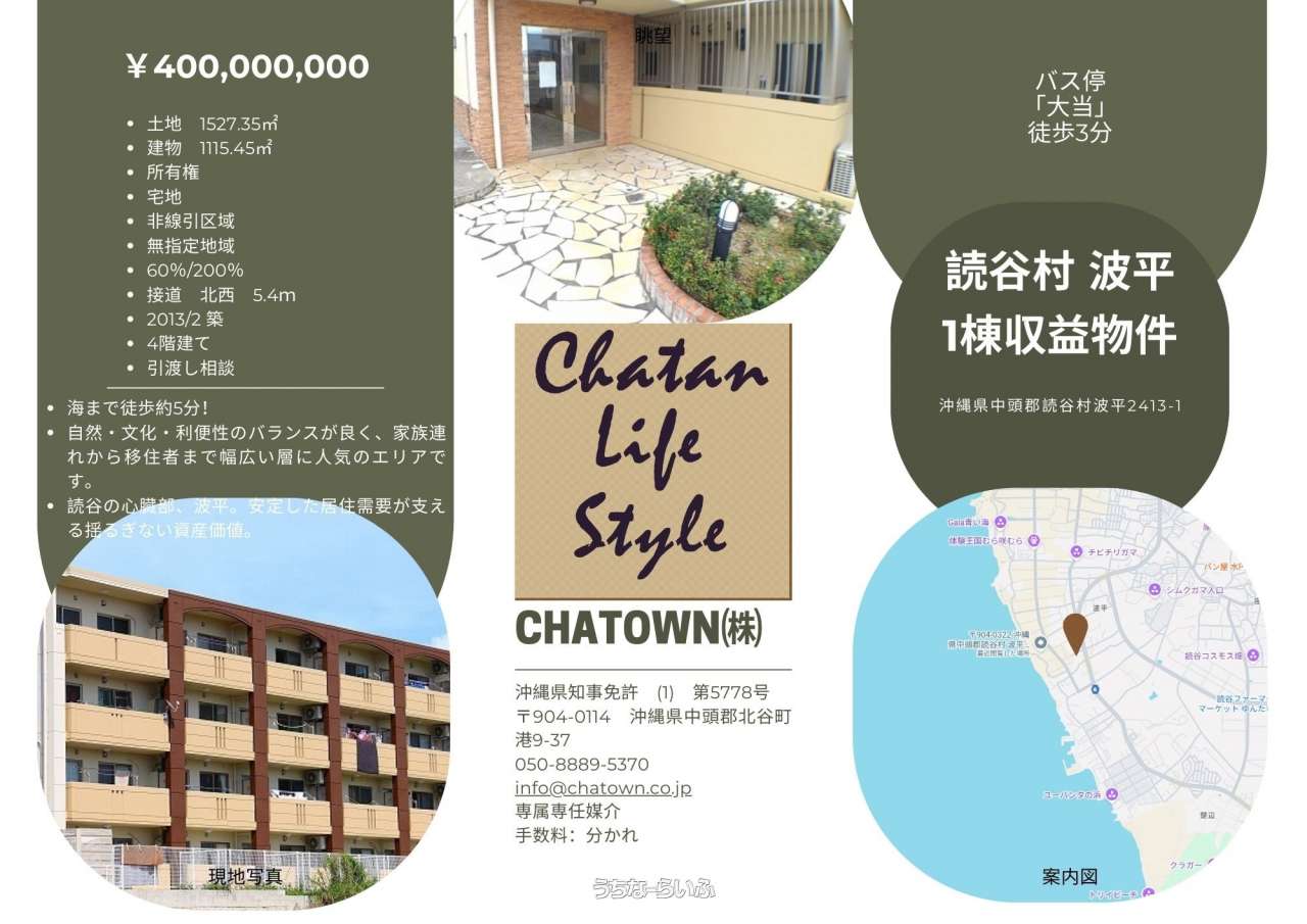 | 建ぺい率 / 容積率 | 60% / 200% | 所在地 | 読谷村波平 地図 |