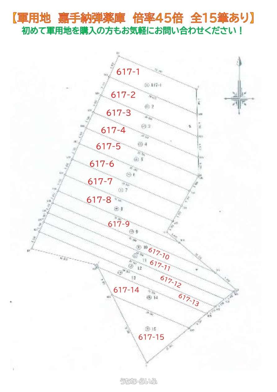 【軍用地でました!1筆から複数の購入も相談できます】嘉手納弾薬庫 倍率45倍 返還予定なし 宅地見込み地 借地料年額(約22.7万) ※令和7年度、年間地料上昇率1.26% 全15筆