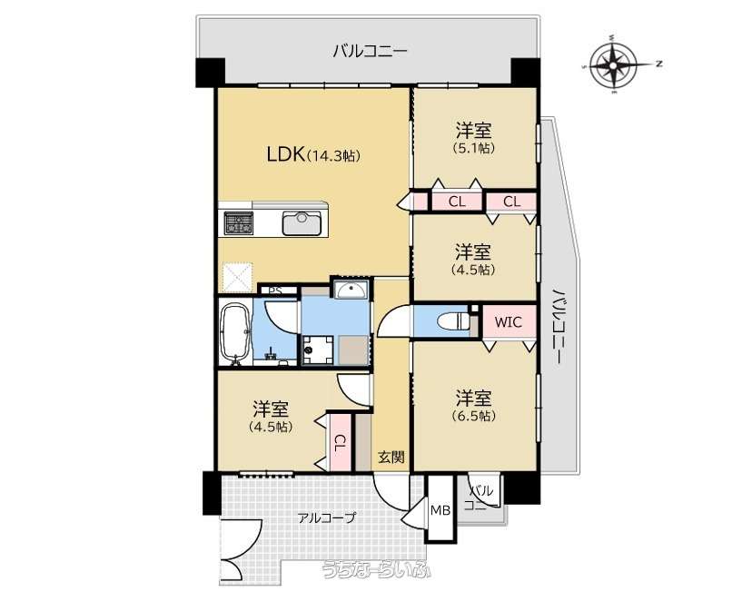 | 間取り | 4LDK ( 洋6.5 洋5.1 洋4.5 洋4.5 LDK14.3 ※WIC・3面バルコニー(面積:27.69㎡/約8.38坪)) | ペット | 可 ※マンション規約に基づく、ペット手洗い場あり |