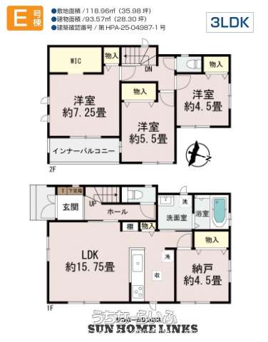 | 建物面積 | 93.57m² / 28.3坪 | 土地面積 | 118.96m² / 35.98坪 |