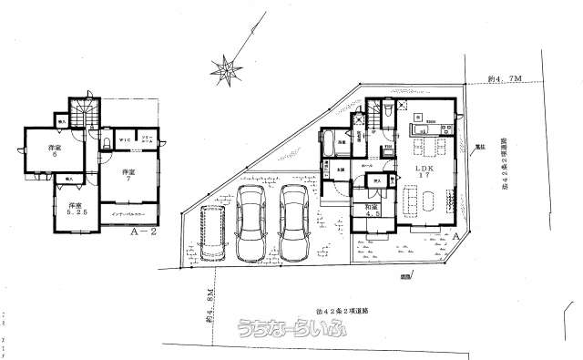 | 用途地域 | 第二種低層 | 接道方向 / 道路幅員 | 北東4.5m、 南東4.5m |