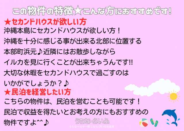 | 備考 | 《周辺環境》 ◆本部小学校・・徒歩約41分(車約7分) ◆本部中学校・・徒歩約37分(車約7分) --------------------------------- ◆サンエーV21もとぶ食品館・・車約6分 ◆タウンプラザかねひで美ら海市場・・車約6分 ◆ザ・ビッグエクスプレスもとぶ店・・車約6分 ◆ローソン 本部浦崎店・・徒歩約6分(車約1分) ◆琉球銀行 本部支店・・車約5分 ◆美ら海水族館・・車約8分 ◆備瀬のフクギ並木・・車約6分 ◆ゴリラチョップ・車約9分 ◆新テーマパーク JUNGLIA(ジャングリア)・・車で約23分 |