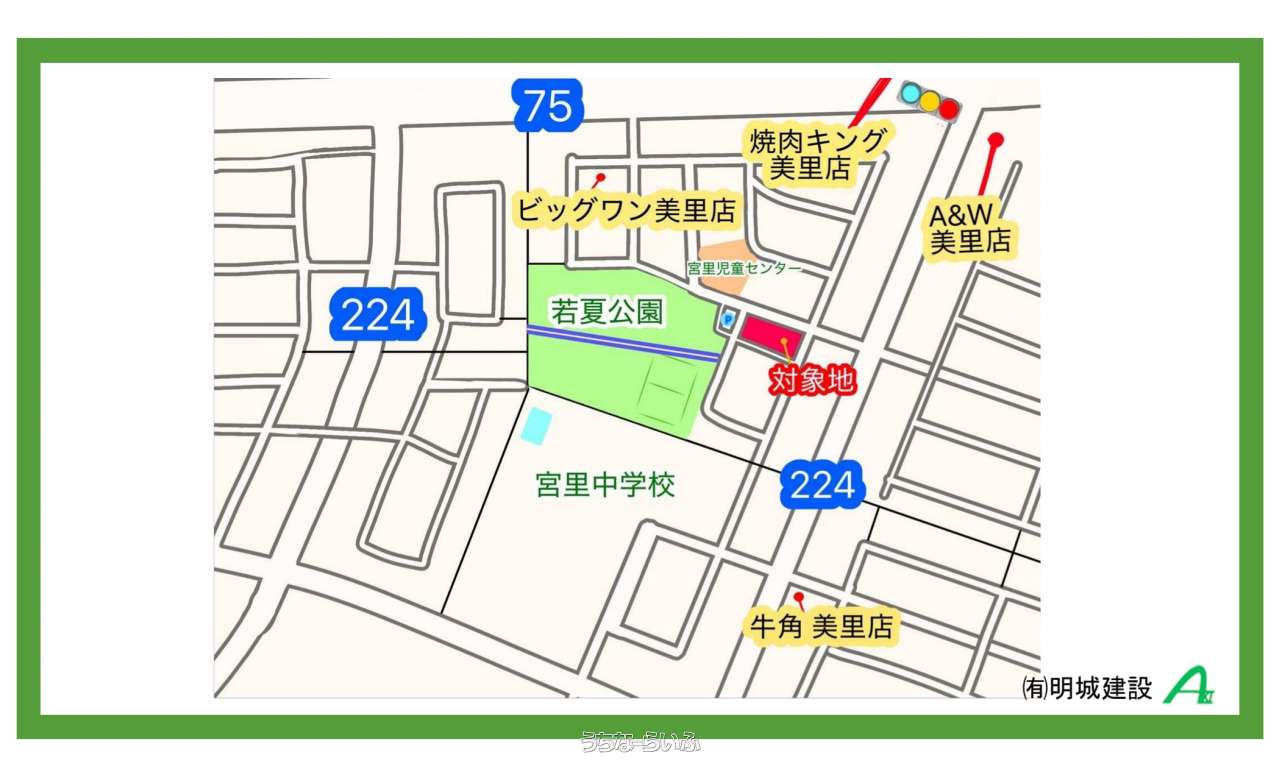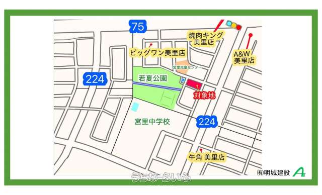 | 備考 | 当社にて設計から施工を行う事が条件となります。建物はRC造でご要望を伺っての自由設計による注文住宅となります為、ご来社または現地にてご説明させて頂きます。 ・美里第二区画整理地内 ・若夏公園がすぐ隣で、子育て環境や運動不足解消などが出来る良い環境です! ・買物、外食も程よく近場にあり、通勤も便利な立地です。 |