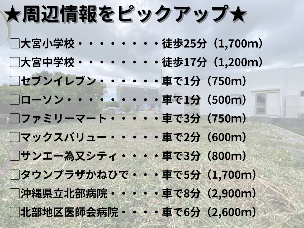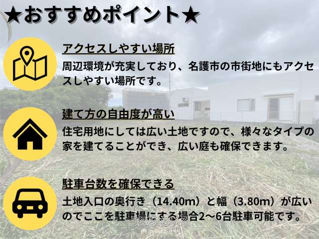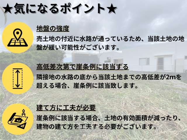 | 備考 | ★おすすめポイント★ 1.アクセスしやすい場所 周辺環境が充実しており、市街地にもアクセスしやすい場所です。 2.建て方の自由度が高い 346.00㎡(104.67坪)と住宅用地にしては広い土地ですので、様々なタイプの家を建てることでき、広い庭も確保できます。 3.駐車台数を確保できる 土地入口の奥行き(14.40m)と幅(3.80m)と広いのでここを駐車場とする場合2~6台程駐車可能です。 ★気になるポイント★ 1.地盤の強度 当該土地の付近に水路が通っているため地盤が緩い可能性がございます。 2.高低差次第で崖条例に該当する 隣接地の水路の底から当該土地までの高低差が2mを越える場合、崖条例に該当致します。 3.建て方に工夫が必要 崖条例に該当する場合、土地の有効面積が減ったり、建物の建て方を工夫する必要がございます。 ★周辺情報をピックアップ★ □大宮小学校・・・・・・・・徒歩25分(1,700m) □大宮中学校・・・・・・・・徒歩17分(1,200m) □セブンイレブン・・・・・・車で1分(750m) □ローソン・・・・・・・・・車で1分(500m) □ファミリーマート・・・・・車で3分(750m) □マックスバリュー・・・・・車で2分(600m) □サンエー為又シティ・・・・車で3分(800m) □タウンプラザかねひで・・・車で5分(1,700m) □沖縄県立北部病院・・・・・車で8分(2,900m) □北部地区医師会病院・・・・車で6分(2,600m) ★物件引き渡しまでの流れ(住宅ローンをご利用の場合)★ ①物件探し⇒②購入相談⇒③物件見学⇒④購入のお申し込み⇒⑤住宅ローンのご相談⇒⑥売買契約の締結⇒⑦住宅ローンのお申し込み⇒⑧残金決済と物件引渡し ※お問い合わせ、その他詳細は随時承っておりますので、お気軽にご連絡ください。 |