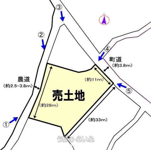 | 用途地域 | 未指定 | 接道方向 / 道路幅員 | 北東4m、 北西3m |