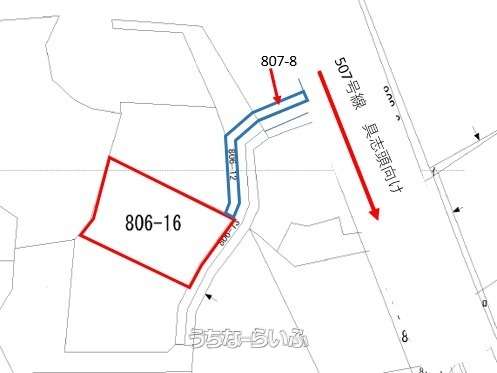 | 備考 | 緩和区域の為、農地法5条許可申請、開発行為許可申請等が必要となります。 私道負担あり507号線から接道、道路部分66.04㎡ その他、詳細はネストハウスまでお問い合わせください。 |